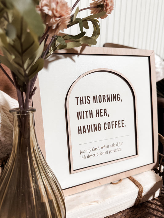 This Morning With Her Having Coffee Boho Sign | Laser Engraved | Boho Decor | Handmade | Boho Shelf Sign | Arched Signs