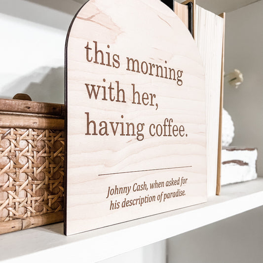 This Morning With Her Having Coffee Boho Sign | Laser Engraved | Boho Decor | Handmade | Boho Shelf Sign | Arched Signs